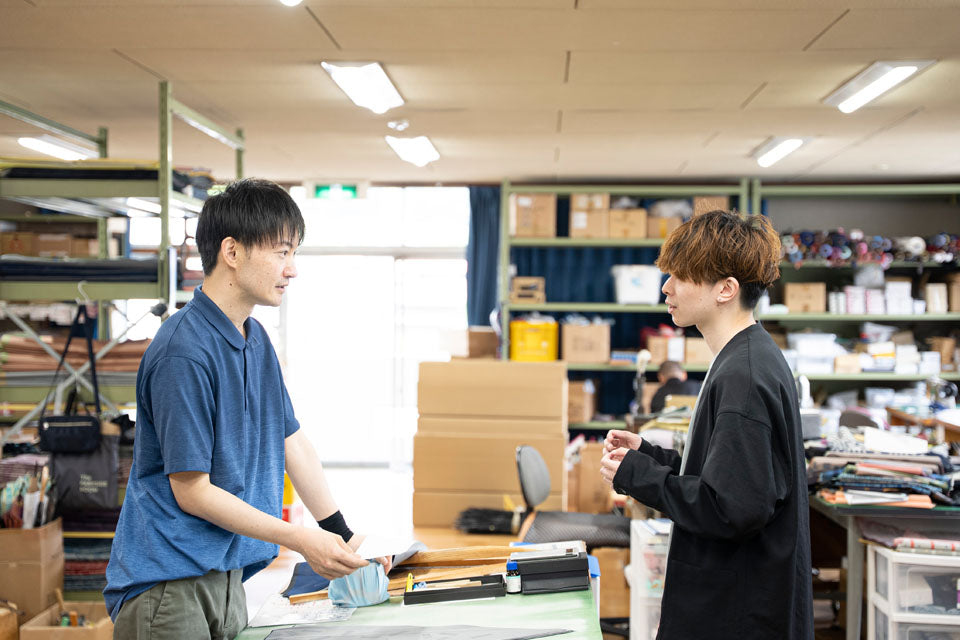 オリジナルブランド「槇田商店」の生産管理から、オンラインショップの受発注やポップアップの対応と、幅広い業務を手がけています。
