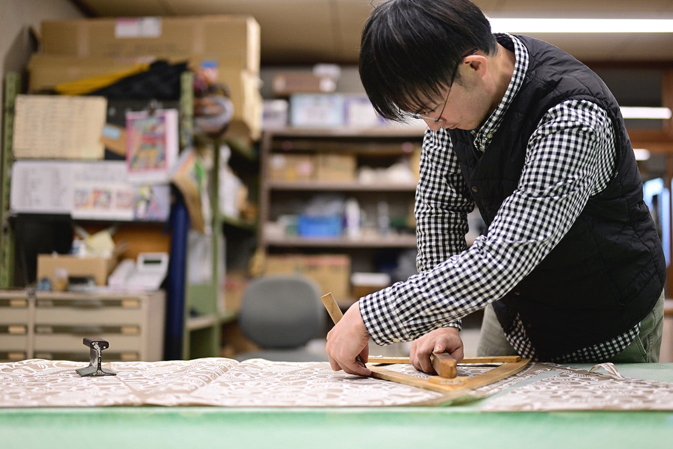 伝統である甲斐絹(カイキ)をベースとした、高密度で繊細な絵柄を織り上げる技術を継承する織り職人チーム。