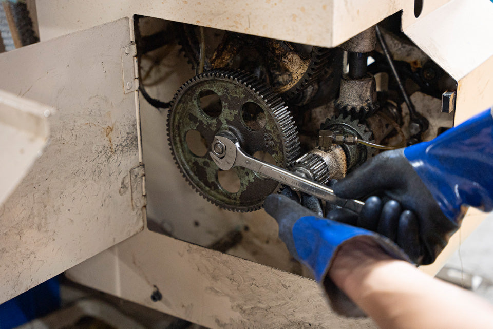織機の“クセ”を読み取ることも大切です。2丁(2色の色糸を使う)で織っているところに4丁で織ったら織れない、この織機では織れたのに、同じ条件で他の織機で織ったら織れない、というケースもあります。レピアと呼ばれる部品のコンディション次第で、緯糸(ヨコイト)がうまく通らないで経糸(タテイト)をズバッと切ってしまうなんてこともありますし、柄に乱れが出たりする場合があります。ですから、織機の掃除やグリスの差し方、ギアの締め具合まで、日々のメンテナンスは欠かせません。