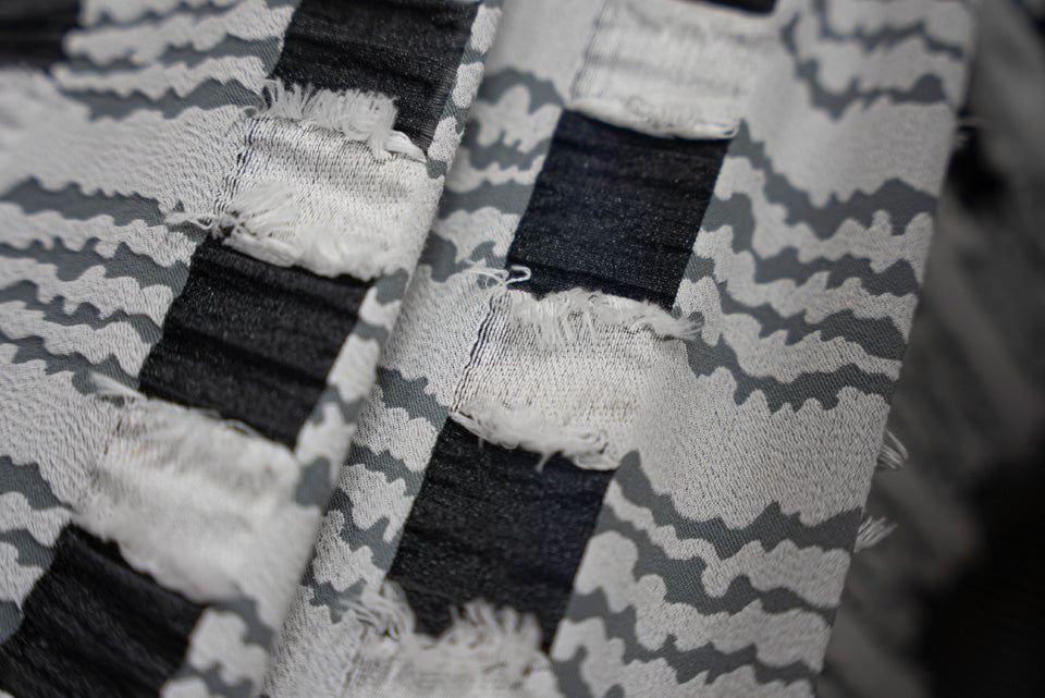 ストレッチ糸に傷を作ることなく織るのは特に難しいですね。織りやすいように糸が糊付けされた状態で届くので、経糸を捌く作業工程で糸をうまく扱わないと、織るときに糸が一斉に動いて傷ができる場合があります。ゴムにポリエステルが巻いてある糸なので、経糸をさばくときにも注意が必要です。織っている時にゴムが切れていたとしてもわからないので、特に細心の注意を払っています。