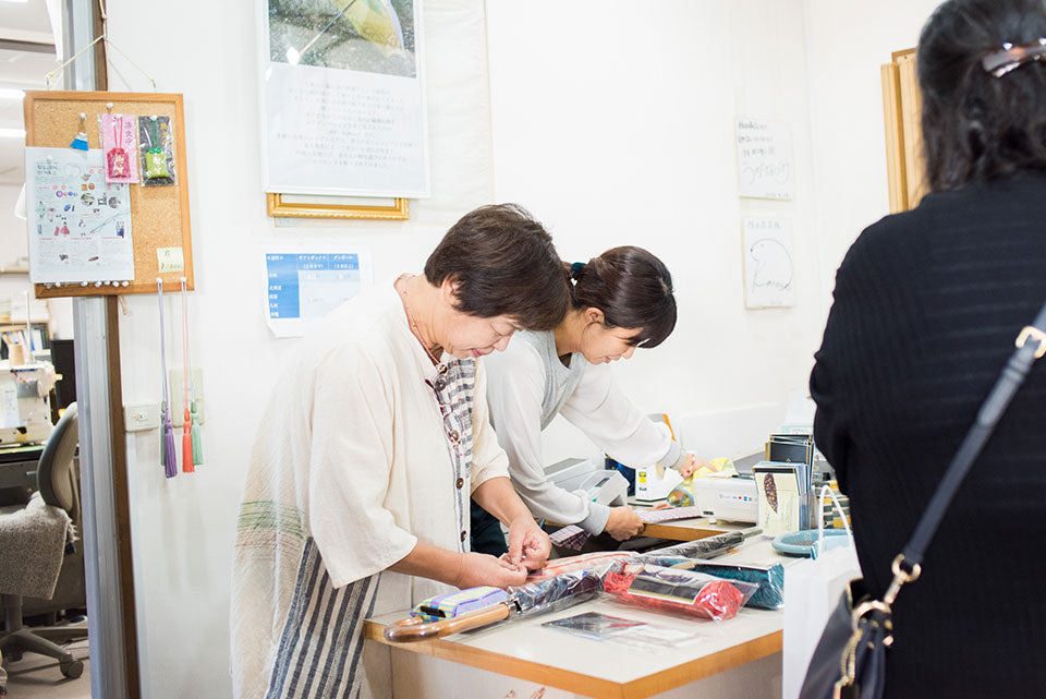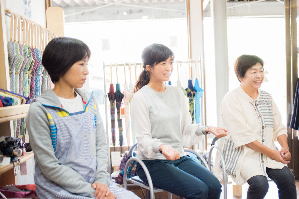 糸一本からすべて手がける槙田商店において、お客様方に直接傘を販売するお仕事を担当している3名にお話をお伺いします。 おかみさんのはるこさん、若おかみさんのかなさん、槙田商店歴17年のよしえさんです。