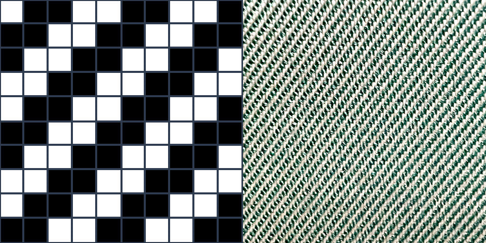 ツイルや斜紋織とも呼ばれる織り目がナナメになっている織組織。デニム生地などに使用されており、伸縮性に優れ、シワの寄りにくい生地になります。