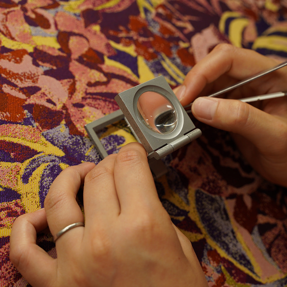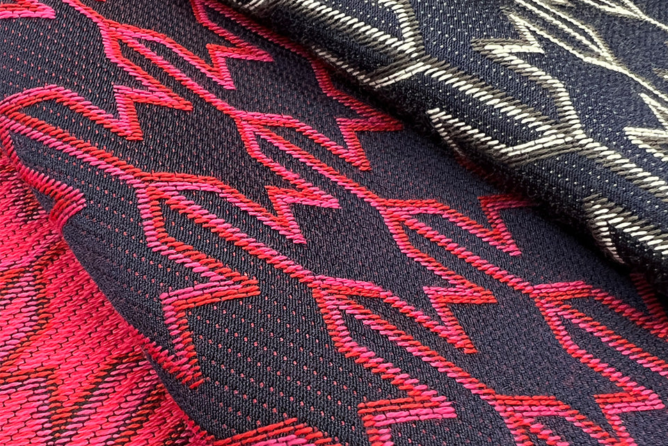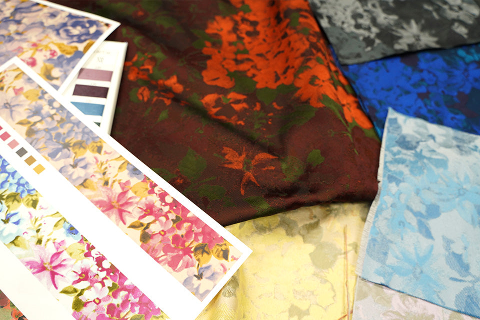 使用する糸や組織によって仕上がりイメージが異なりますので、まずはサンプル(着分)を織ります。5m程度の試織では、布目が曲がってしまうことから、当社では15〜20m程度の試織を推奨しています。整理加工を施した織物の色や風合いを確かめていただき、細やかな織組織の調整や配色パターンなどを決めていきます。