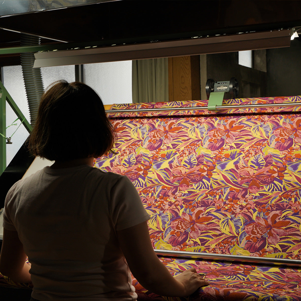 槙田商店では一から生地づくりができる強みを生かし、クリエイターの方々と共に新しい技術や未知の織物への挑戦をし続けています。