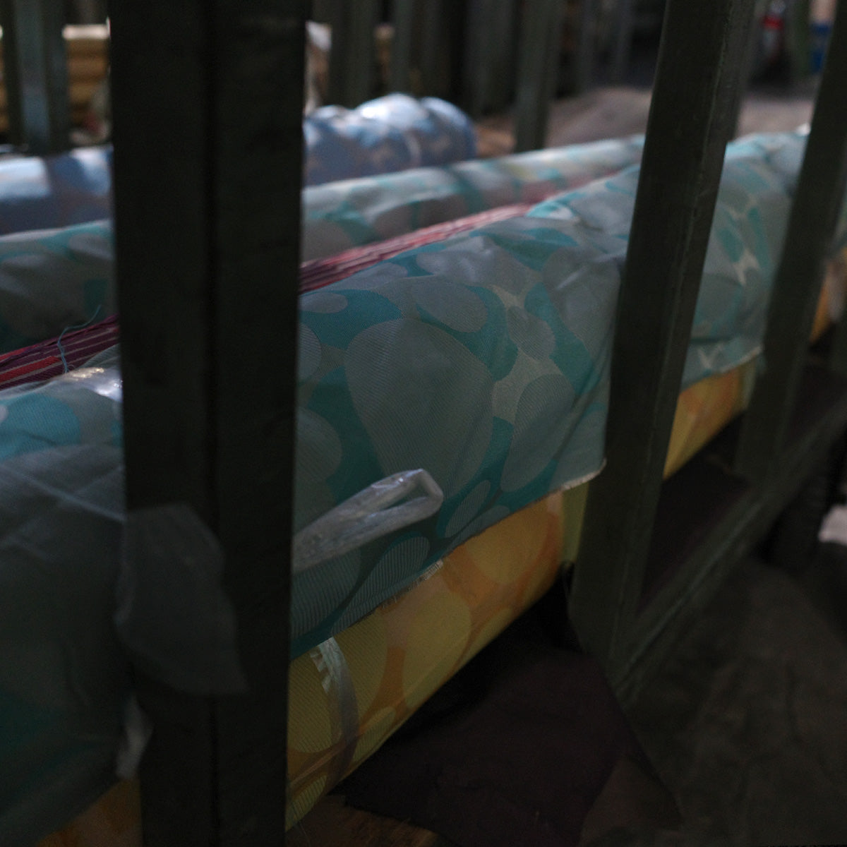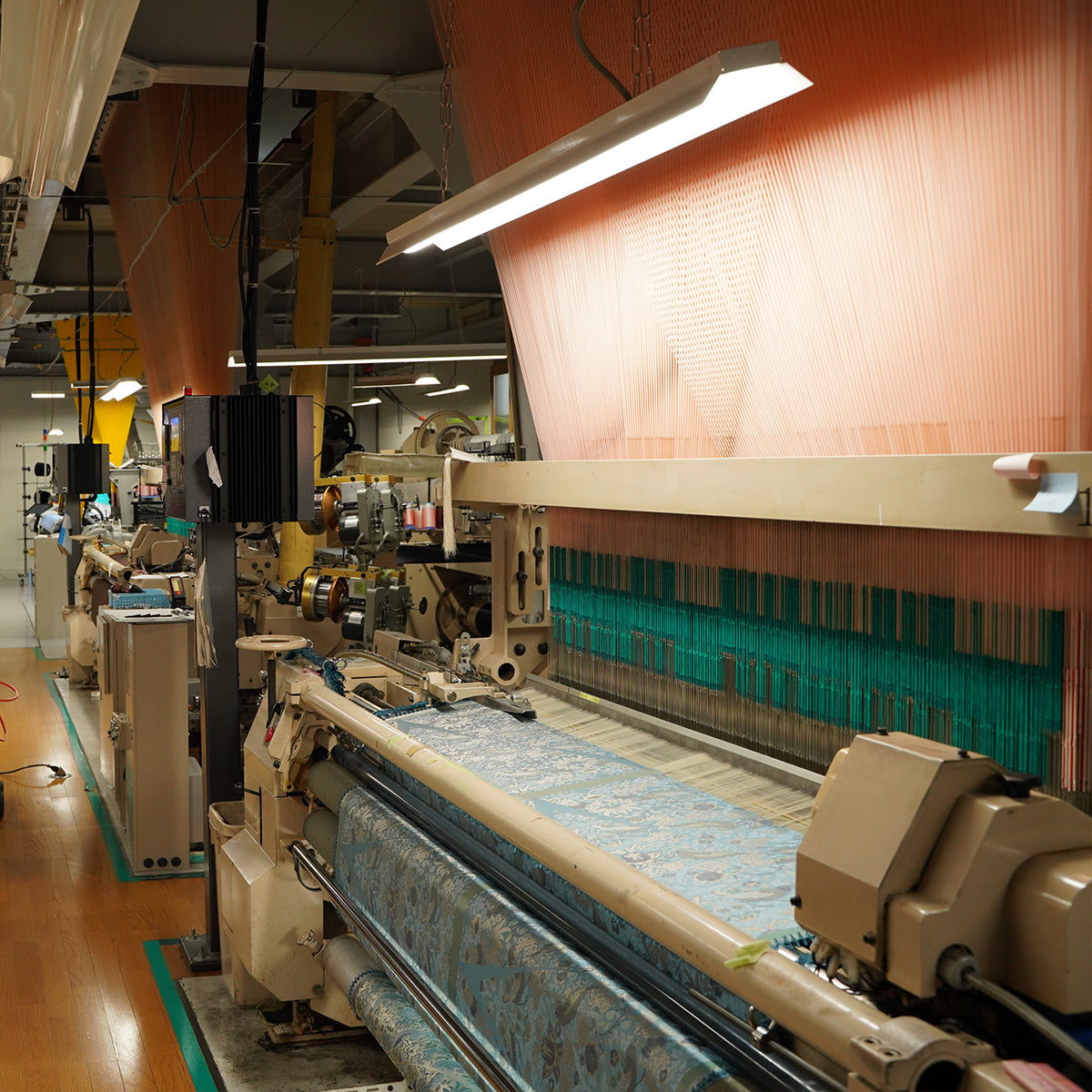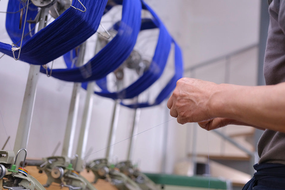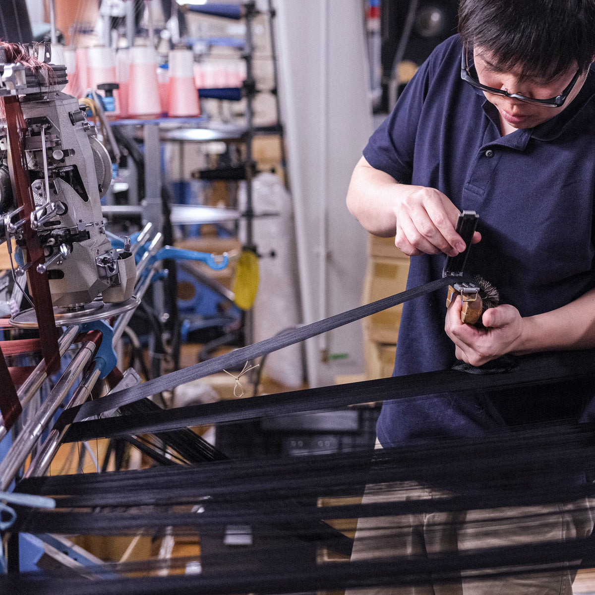 納得のいく仕上がりのサンプル生地ができたら、いよいよ本番の生地を織り出します。機械で織るとはいえども、髪の毛1本ほどの細い糸の扱いは非常に繊細な作業で、時には何千本という糸を手作業で繋いでいくこともあります。糸1本1本に気を配りながら織物を織り上げていくのは、根気と技術がいる作業です。