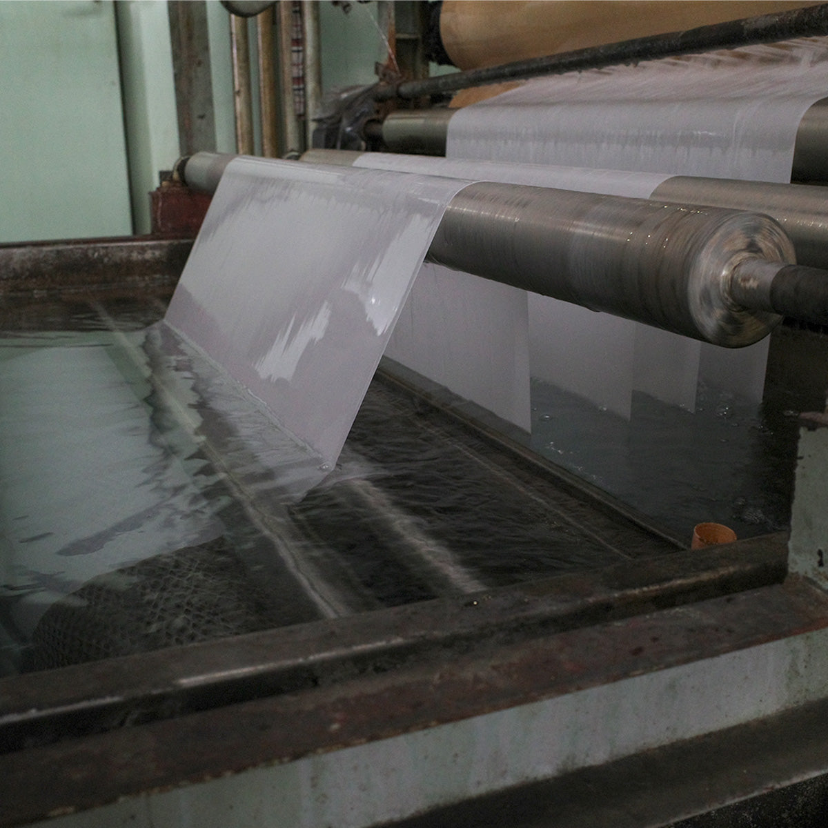 織りあがった生地は、同じ地域の生地の整理加工所に依頼し、加工作業を施します。洗浄、しわ伸ばし、アイロンなどにより生地の風合いを整える加工。傘生地などの場合は撥水、防水、遮熱などの機能性コーディング加工を施したりします。