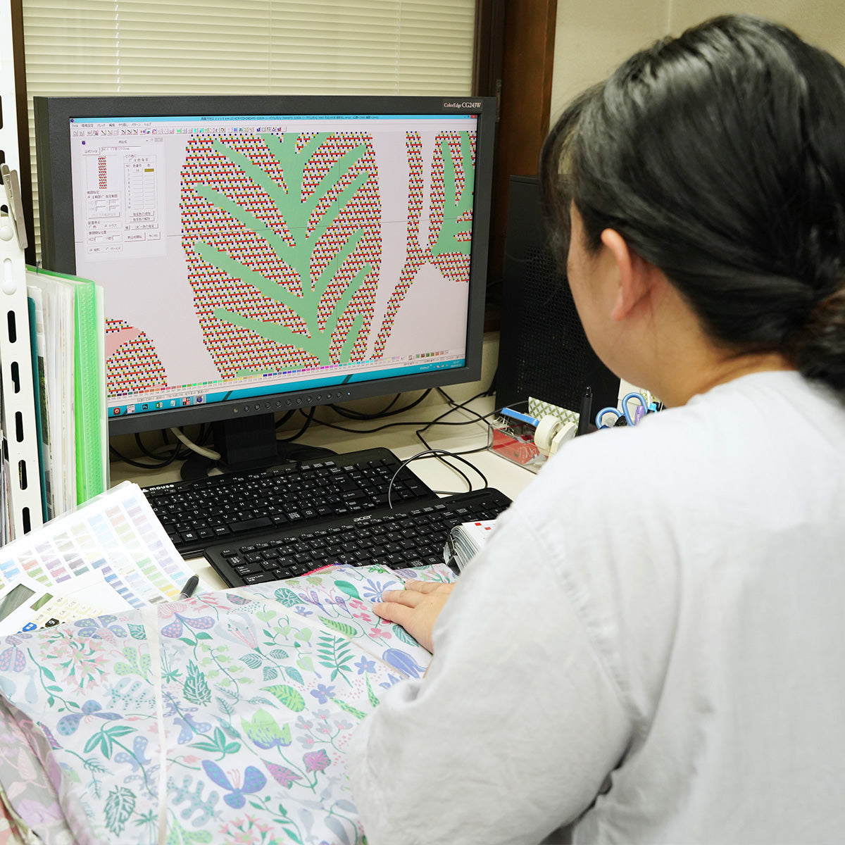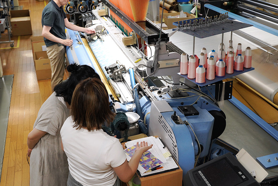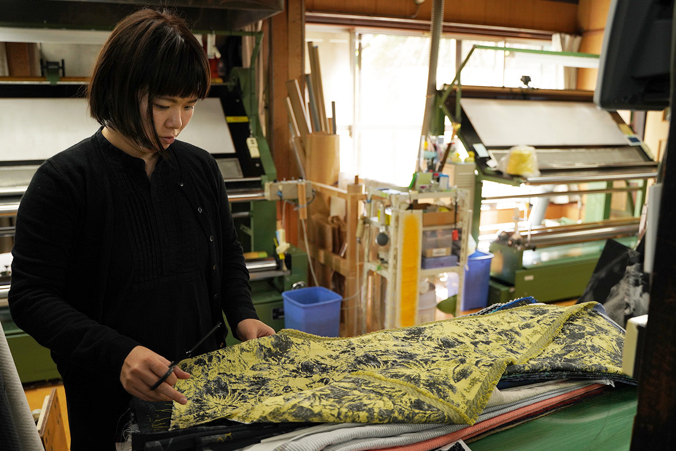 お客様の納期を確認しながらスケジュールの調整を行う作業も、重要な仕事のひとつです。織物には多くの準備工程があるので職人さんと密に連携を取りながら、調整をする必要があります。織機にどんな経糸がかかっているのかを把握しながら緯糸の発注状況を確認します。最近では新型コロナウイルス感染症や世界情勢の影響から糸が入荷しにくい状況が続いていますが、企画部で連携を取りながら、魅力的なテキスタイルが作れるようなサポート体制を築いています。槙田商店には、生地幅が約1800mmまで織れる大型のジャカード織機があるので、とても大胆な柄の織物を織ることも出来ます。是非、テキスタイルを作ってみたいデザイナーさんからお気軽にお問い合わせいただけると嬉しいです。