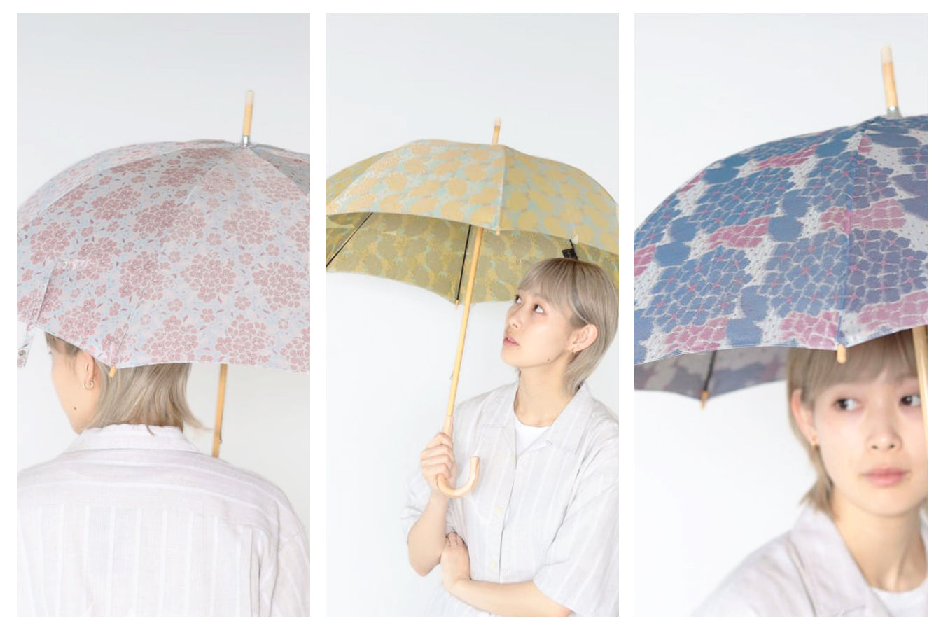 BEAMS JAPANとコラボレーションした四季を楽しむ「花」がテーマの晴雨兼用傘。テキスタイルデザイナー杉崎 愛氏が手がけた、立体感のあるやわらかな色合いの「桜」「紫陽花」「菊」のデザインは日常に彩りを添えてくれる品のある可愛らしい傘です。